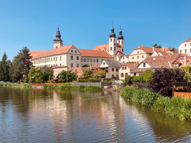 De verwachtingen zijn groot als ik koers zet naar Telč. De plaats met slechts 6000 inwoners ligt in het zuiden van Tsjechië en wordt omschreven als het best bewaarde middeleeuwse stadje van het land. Het stadscentrum pronkt sinds 1992 op de Werelderfgoedlijst van Unesco. Het lijkt de moeite waard voor een tussenstop. Camping U Rostenky (https://www.urostenky.cz/) is een eenvoudige familiecamping met een restaurantje aan een zwemmeer op een boogscheut van het centrum. Het kampeerterrein heeft twee toegangswegen waarvan de ene naast de drukke hoofdweg ligt. Deze ingang neem je best bij aankomst. De toegangsweg is breder en meer geschikt voor campers. Aan de andere kant ligt een smalle verharde weg naast de grote zwemvijver. Die kant is dan weer uitstekend om al wandelend de stad te bezoeken. Zo vermijd je de drukke hoofdbaan. Ga op het einde naar links en na 200 m bereik je een fiets- en wandelpad naast de Telčský rivier tot bijna in het stadscentrum. Deze route is leuker en veiliger als voetganger.