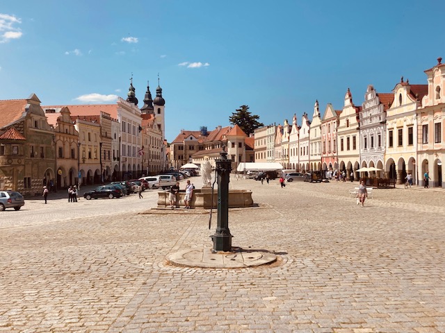 Op het heerlijke plein met de fameuze herenhuizen spelen leuke terrassen van café’s en restaurants, banketbakkerijen en souvenirwinkels een hoofdrol. Maar er is nog meer, tenminste op “normale” dagen. In het Telčský-huis loopt een permanente tentoonstelling over de geschiedenis en de legendes van Telč. Het kasteel en de kasteeltuinen zijn sinds kort open voor het publiek. De toren van de barokke kerk op het marktplein is te beklimmen voor een mooi uitzicht over de stad. En er is het techniekmuseum waar oude auto’s en motoren te bewonderen zijn. De verschillende vijvers rond de stad zorgen voor een rustgevende toets. Alleen de vijvers en het stadsplein staan vandaag ter beschikking. Van de rest komt allemaal niets in huis. Het is namelijk Pinkstermaandag en alles is gesloten. Ik sluit mijn stadsbezoek af in een van de restaurants op het marktplein met een lekkere en betaalbare maaltijd, terwijl ik ten volle geniet van de mooie omgeving.
