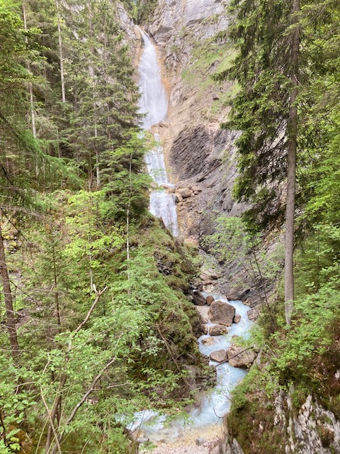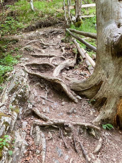 Om de hoger gelegen waterval te bereiken, komt er af en toe pittig klimwerk bij kijken. Het is soms een serieuze evenwichtsoefening over uitstekende boomwortels en rotsblokken. De route gaat via provisoir aangelegde bruggetjes over de stromende rivier en zo nu en dan wordt het pad ineens erg smal naast een afgrond. Het klimmen en dalen vraagt bijwijlen best wat concentratie. Voor zulke tochten liggen er handige wandelstokken in mijn bus. En ja, natuurlijk ben ik die vergeten! Betonnen trappen leiden naar een houten brug en een soort platform waar je een uitstekend zicht hebt op de waterval. Het water stort in een razende vaart 100 m naar beneden in een indrukwekkende rotsenkloof. Het is mogelijk om nog dichter bij de waterval te komen langs een korte via ferrata die gebouwd is op de naastgelegen rotsen. Er staat overal te lezen dat deze route enkel geschikt is voor ervaren klimmers. Uit veiligheidsoverwegingen laat ik dat traject links liggen.