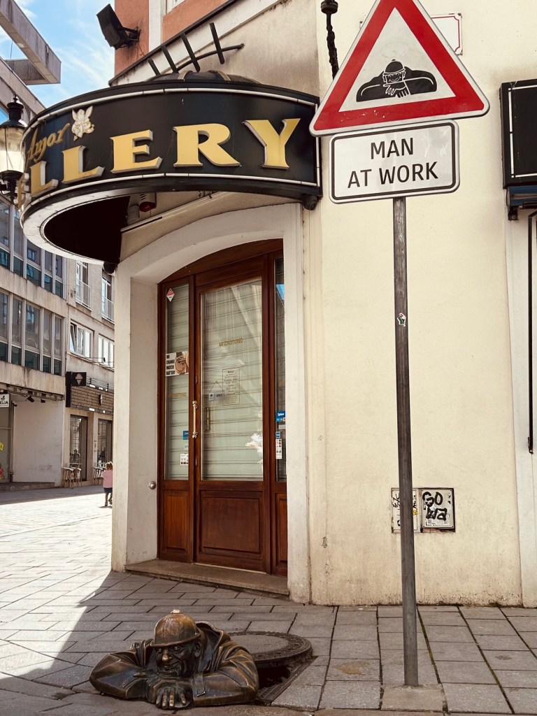 Een stadswandeling door Bratislava is ook een tocht langs tal van standbeelden waar toeristen graag mee op de foto gaan. Er zijn mooie sculpturen, minder mooie en ook grappige. Zo vind je op het centrumplein het standbeeld van een werkende man. Het is een bronzen beeld van een rioolwerker die uitrust op de rand van een mangat en passanten gadeslaat. Als je zijn hoofd aanraakt, mag je een wens doen.