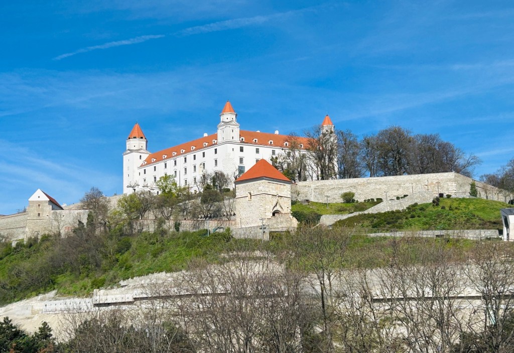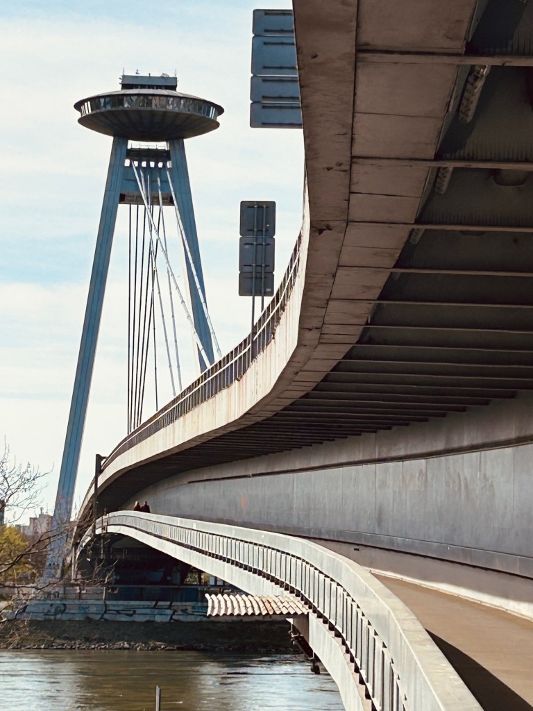 Ik stap af bij de ‘dubbele’ SNP brug naast de UFO toren bij de Donau. Dubbele brug omdat bovenaan het gemotoriseerd vervoer rijdt en onderaan de fietsers en voetgangers. De UFO uitkijktoren is het symbool van Bratislava zoals de Eiffeltoren dat voor Parijs is. Het uitkijkplatvorm bevindt zich 95 meter boven de rivier en bij helder weer kan je 100 km in elke richting het landschap bewonderen. Bovenin bevindt zich een bar en een restaurant. Voor klanten is het betreden van het uitkijkplatvorm gratis. Wie alleen wil kijken zonder iets te consumeren, betaalt entreegeld. De UFO toren is dagelijks geopend tussen 10.00 uur en 23.00 uur. Ik ben een vroege vogel en de voordeur is nog gesloten. Ik wandel de brug over langs de ene kant, bewonder de UFO en keer via de andere zijde, waar je een mooi uitzicht op het kasteel van Bratislava hebt, terug.