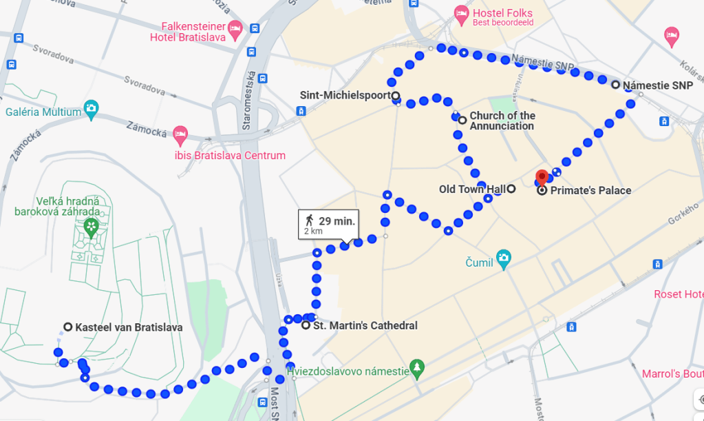 Bratislava is sinds 1993 de jonge hoofdstad van Slowakije, maar dat is niet altijd zo geweest. De stad, die ooit Prešporok heette, behoorde lange tijd tot het machtige Hongaarse rijk. In 1526 werden de Hongaren verslagen door de Turken waardoor het gebied uiteen viel. Een deel kwam onder het gezag van het Ottomaanse rijk. Budapest dat tot dan toe de hoofdstad was van het Hongaarse rijk, viel ook in handen van de Ottomanen. In Slowakije kon de Oostenrijks-Hongaarse monarchie zich handhaven en de hoofdstad verschoof naar het huidige Bratislava. Tussen 1526 en 1784 bleef de monarchie in Bratislava en tot 1830 werden daar 19 Habsburgse vorsten gekroond. De kroning van een vorst was een hele belevenis die gepaard ging met een soort triomftocht door het centrum. Als je in de voetsporen wil treden van de vroegere koningen kan je de Kroningsroute volgen. Dat doe je door de gouden kroontjes op de grond te volgen. Toegegeven, het is niet altijd even gemakkelijk. Soms zijn de kroontjes afgesleten en soms raak je gewoon het spoor bijster. Het is in elk geval een leuke wandeling door autovrije straten langs historische gebouwen en torens. De Kroningsroute op het kaartje is waarschijnlijk niet 100% juist, maar tot zover was ik in ieder geval zelf mee.