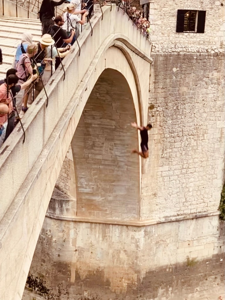 De Stari Most is waarschijnlijk de grootste toeristische trekpleister in Bosnië en Herzegovina. Het is oppassen geblazen want de gladde stenen op de brug zorgen af en toe voor uitschuivers. Alleen dames, geboren en getogen in Mostar, zijn in staat om de oversteek min of meer sierlijk klaar te spelen op naaldhakken. Hoe ze dat doen, blijft een groot raadsel. Probeer het in geen geval na te bootsen! Veel buitenlandse toeristen die in Kroatië op vakantie zijn, komen voor een daguitstap naar Mostar. Ze worden massaal met touringcars bij het oude stadsgedeelte gedropt en haasten zich vervolgens met hun gids naar de constructie over de Neretva om getuige te zijn van een riskante sprong in de ijskoude rivier. Ooit bewezen 16-jarige jongens volgens de traditie hiermee hun mannelijkheid. Tegenwoordig zijn het professionele springers die de toeristen entertainen. Wanneer ze €50 verzameld hebben bij voorbijgangers springen ze om beurten, volgens een bepaald springschema, onder luid applaus van de toeschouwers het koude sop tegemoet. Het spektakel is er niet minder om en het blijft een spannende oefening die niet zonder gevaar is.