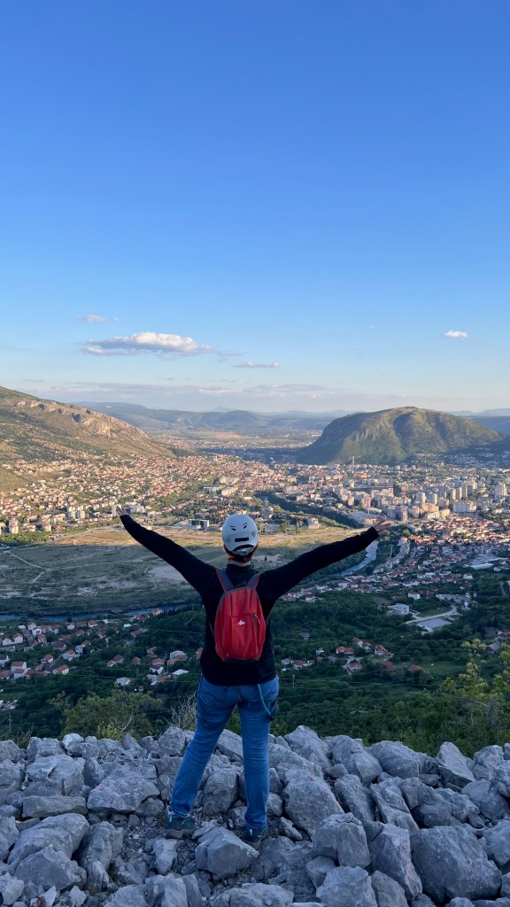 Het werkelijke klimtraject van de via ferrata is ongeveer een kilometer lang. Tussen de klimstroken door volgen enkele kortstondige klauterpartijen waarbij je voornamelijk oneffen paden met grote rotsblokken en een paar smallere doorgangen trotseert. Er is onderweg niet veel tijd om op je lauweren te rusten al last Julijana wel enkele pauzes in om iets te eten of te drinken. Zoals je merkt, neemt ze ook voortdurend foto’s van de deelnemers. Die worden achteraf per mail toegestuurd. De beloning van alle inspanningen volgt op de top met een panoramisch uitzicht over de stad Mostar.