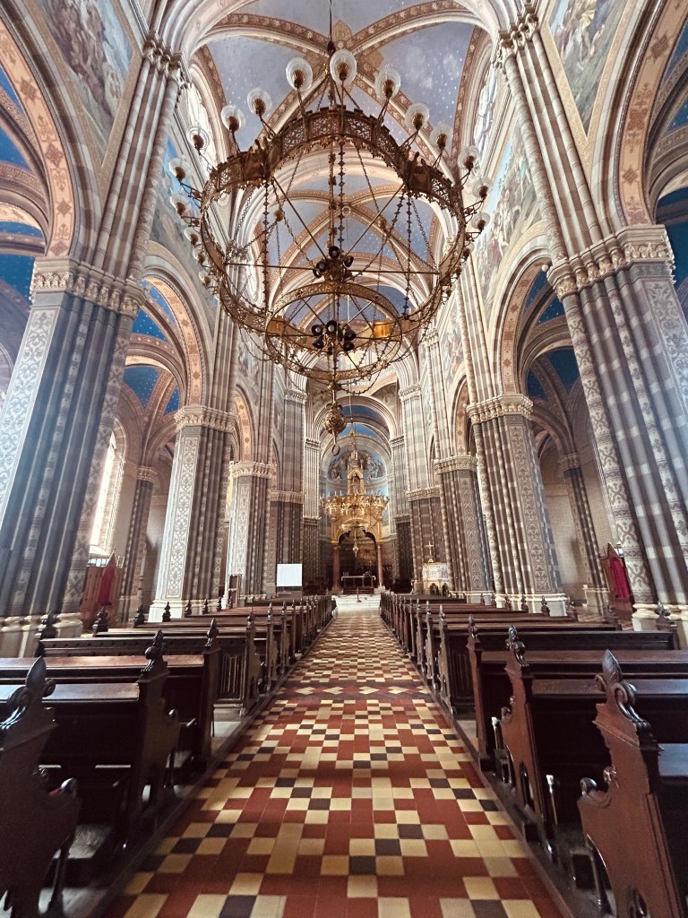 Na mijn bezoek aan de stallen bij het centrum, is het tijd om de stad verkennen. Đakovo telt bijna 30.000 inwoners. Het centrum is klein en de mooiste gebouwen bevinden zich op loopafstand van elkaar. Het paradepaardje van Đakovo is ongetwijfeld de Sint-Pieters kathedraal, die meteen de grootste van Kroatië is. De kathedraal werd gebouwd tussen 1866 en 1882. Het was een van de vele realisaties van bisschop Josip Juraj Strossmayer tijdens de 55 jaar dat hij bisschop was. Het duurde vier jaar lang om de kathedraal in rode baksteen op te trekken en daarna besteedde men nog eens twaalf jaar om het interieur te versieren. Er zijn maar liefst zeven altaren, talrijke fresco’s, schilderijen en heiligenbeelden, al heb ik die niet allemaal gevonden. Het resultaat mag gezien worden. Ik zag zelden een kerk die zo mooi is. Bisschop Strossmayer kreeg veel erkenning voor zijn realisaties in Đakovo. Naast het bouwen van infrastructuur ijverde hij voor vrouwenrechten en pleitte hij voor toenadering tussen de verschillende religieuze strekkingen. In het gele pand aan de rechterkant naast het kerkgebouw is een museum, gewijd aan het leven van de bisschop.