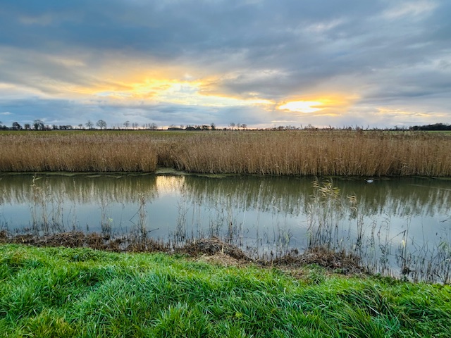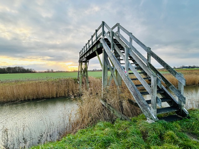 Meteen na de passage van de kerk leidt een klein verhard voetpad door open velden en via de Pieterbuurstermaar langzaam maar zeker naar het dorp Eenrum. De Pieterbuurstermaar is een kleine waterloop, een voormalige wadgeul. Sommige stukken hebben een natuurlijke oorsprong en zijn ontstaan in de periode dat er nog geen dijken waren door de speling van eb en vloed. Andere stukken zijn uitgegraven. De ‘maar’ in de naam duidt erop dat de waterloop groot genoeg is om erin te kunnen varen. Het waren ooit de vaargeulen die de dorpen verbonden. Het riviertje wordt overspannen door een hoog, houten voetgangersbruggetje. Hier noemt men dat een ‘hoogholtje’. De brug is relatief hoog omdat een bootje, gevuld met een vracht er makkelijk onderdoor zou kunnen. Het is een vogelrijk gebied. Ik spot vooral eenden.
