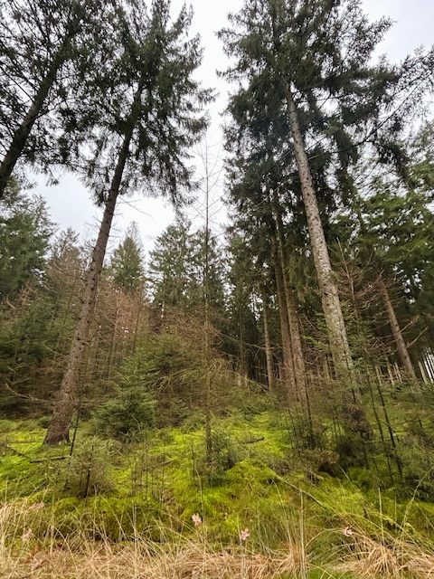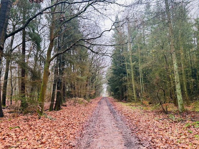 De tweede helft van de etappe gaat door de boswachterij Gieten-Borger. De lange bospaden met voornamelijk naaldbomen en in mindere mate loofbomen, werden na de Eerste Wereldoorlog aangelegd door werklozen voor de houtproductie. Het oorspronkelijke heidelandschap veranderde hierdoor in een boslandschap. De rechte paden en de rechthoekige boskavels verraden het kunstmatige karakter. De ondergrond ligt vol met kleurrijke herfstbladeren en tussen de bomen groeien helgroene mossen. Reeën voelen zich hier thuis. Ze laten zich geregeld zien in de vroege ochtend of tegen zonsondergang. Ik ben te laat of te vroeg om de dieren in levende lijve te ontmoeten.