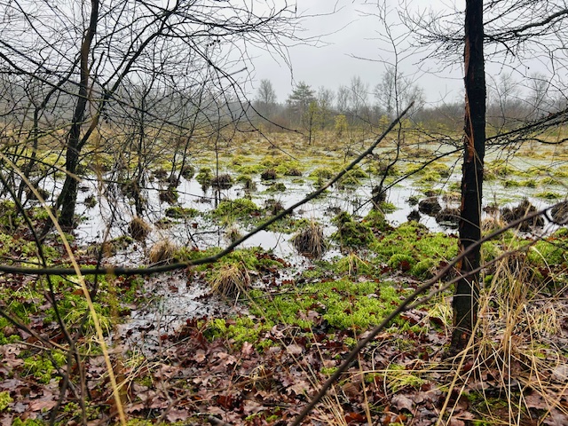 Tussen de bomen door kan je het Meindersveen zien. Het zompige veen staat nu bijna volledig onder water. Het ligt er stil en ingetogen bij. In de zomermaanden is er meer leven in de veenbrouwerij. Dan krioelt het hier van de libellen en de vlinders. De regen heeft het pad modderig en glad gemaakt. Het is een beetje uitkijken om rechtop te blijven. Vaak zijn de grootste plassen en modderpoelen te omzeilen, maar af en toe is het toch een stukje ploeteren.