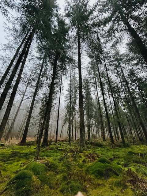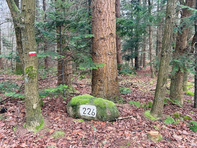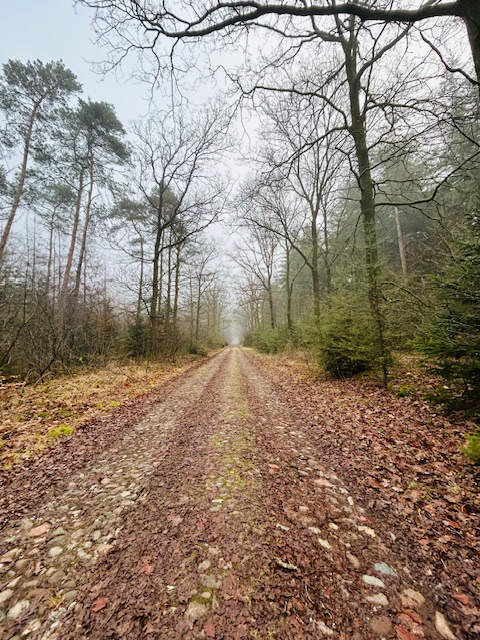 Vanaf dit punt reken ik op mijn eigen “paardenkracht”. De temperatuur duidt -2 aan. Om een beetje op te warmen is het nodig om – figuurlijk – het gaspedaal in te drukken. Het eerste deel van de etappe gaat langs de Boswachterij Schoonloo. Tussen 1920 en 1930 werden hier dennen aangeplant voor de houtproductie in een voormalig heidelandschap. In die tijd heerste er grote werkloosheid. Om de mensen nuttig bezig te houden, liet men hen bomen planten voor de houtproductie. De arbeiders die ondergebracht werden in kampen, leverden zware arbeid. Bij het omspitten van de grond kwamen veel keien tevoorschijn. Deze werden gebruikt om keienwegen door het bos aan te leggen en… om een bank te maken. Langs de Flintenweg staat de 102 jaar oude Flintenbank. Boswachterij Schoonloo was niet de enige plek waar zulke tewerkstellingsprojecten waren. Boswachterij Zweelo en Sleenerzand zijn twee andere voorbeelden. Af en toe zie je onderweg grote stenen waar een getal opstaat. Die dienden om de percelen te nummeren. Dat was handig voor de administratie.