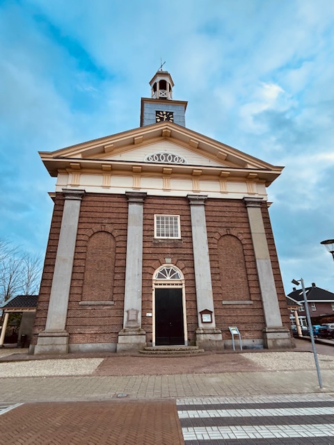 Verhuizen is de eerste activiteit bij het krieken van de dag. Ik installeer de camper op Camping de Prinsenhoeve in Vorden. Deze boerderijcamping ligt aan de rand van het natuurgebied het Groote Veld en 3,5 kilometer van Vorden. In de buurt van Vorden zijn veel kampeermogelijkheden, maar de meeste zijn momenteel in winterrust. Geesje, mijn chauffeur van gisteren, staat al klaar om mij naar het startpunt van de etappe in Laren te brengen. Sommige routes in omgekeerde volgorde lopen, heeft zijn voordelen. Voor de tweede dag op rij sla ik een voorraad heerlijke Pieterpadkoeken in bij Wereldbakker Wijnand. Daarna start de laatste etappe van de week bij de protestantse kerk van Laren. De kerk werd gebouwd in 1834 en 1835 en staat sindsdien letterlijk in het middelpunt van Laren. De financiering gebeurde door de overheid en de architect was ene B. van Zalingen. Tijdens de Tweede Wereldoorlog raakte het gebouw zwaar beschadigd toen de Duitsers de naastgelegen pastorie opbliezen. Na de oorlog werd het gebedshuis in ere hersteld. Het gebouw is sinds 1966 een rijksmonument.