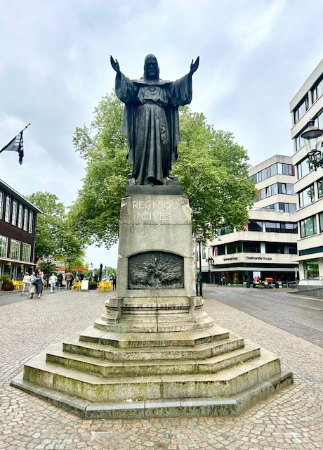 De camper blijft nog een dag langer in Swolgen staan. Ik neem de bus naar Venray en daarna de trein naar Venlo om vervolgens terug naar de camping te lopen. Ik wandel deze etappe in omgekeerde richting. Het startpunt van de wandeling ligt bij het station van Venlo, midden in de historische binnenstad. Venlo is al sinds de middeleeuwen een vestingstad en een internationaal handelscentrum door de gunstig ligging aan de Maas. De Keulsepoort was ooit een van de vier hoofdpoorten om de stad binnen te komen. Van de poort blijft nu niets meer over. Sinds 1921 worden bezoekers verwelkomd door het Heilig Hartbeeld, een staande Christusfiguur op een granieten sokkel uit 1921.