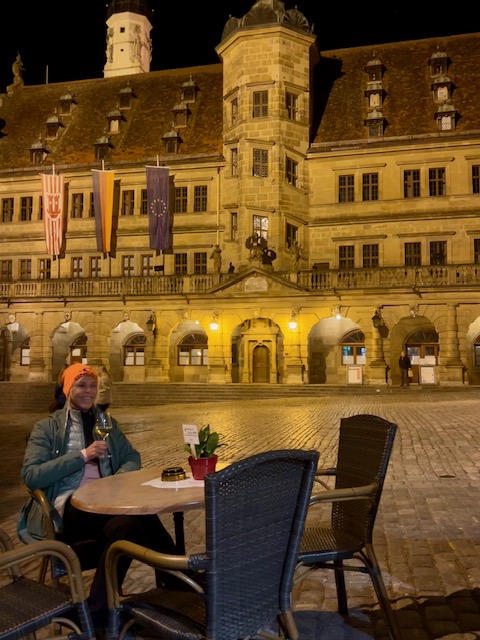 Natalie en ik arriveren in Rothenburg ob der Tauber net voor het donker. Het is vrijdagavond en het stadscentrum is zo goed als verlaten. Er hangt geen weekendsfeer. Het is bizar, maar het is zelfs lastig om een restaurant te vinden waar de keuken nog open is. Uiteindelijk vinden we een eethuis waar we exact tien minuten tijd krijgen om te bestellen want de keuken sluit om 19.30 uur. Het voelt niet erg gastvrij, maar het moet dan maar. Gelukkig vinden we na de maaltijd, die overigens zeer lekker was, een leuke plek op het terras van de Reichstadt Vinothek om wijn te proeven. We zitten op het prachtige marktplein tegenover het gigantische middeleeuwse stadhuis.