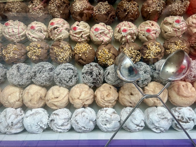 We eindigen in Schmiedgasse, de belangrijkste winkelstraat in het historische centrum. Hier zijn tal van souvenirswinkels, kledingboetieks en schneeballenbakkers. De schneeballen zijn de typische “lekkernij” van Rothenburg ob der Tauber. De beroemde sneeuwballen worden al sinds de negentiende eeuw in vrijwel elke bakkerij verkocht en zijn zowat het symbool van de stad. Je kan er niet omheen. De etalages liggen er vol van. Ze bestaan uit dunne stroken gevlochten deeg ter grootte van een vuist die tot een bol worden gefrituurd. Oorspronkelijk werden de gebakken deegbollen gewoon bestrooid met poedersuiker. Inmiddels bestaan er tientallen varianten met allerlei smaken. Een bezoek aan de stad is niet compleet zonder er een te proeven. De keuze valt op een sneeuwbal met karamel. Het gebak is vrij hard en aan de droge kant. De karamelsmaak is ver te zoeken. Over smaak valt niet te redetwisten en misschien zijn er mensen die het wel lekker vinden. Als je in Rothenburg ob der Tauber bent, hoort een sneeuwbal proeven er gewoon bij…
